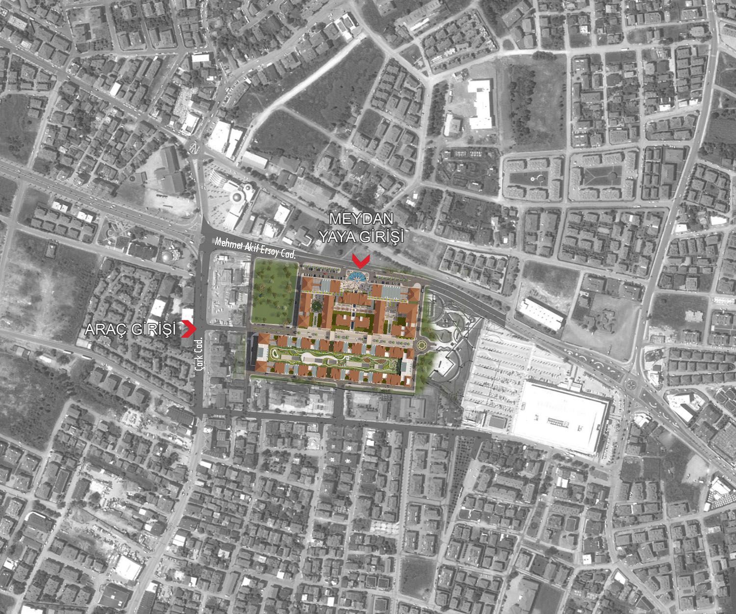 Proje master planlamasında amaç, kentlilerin günlük ihtiyaçlarını karşılayabilecekleri açık semt çarşılarının ve alış-veriş merkezinin; sosyalleşebilecekleri yaya yolları ve meydanlarının; iş hayatının dinamizmini yakalayabilecekleri konforlu ofis alanlarının; farklı ünite planlamasıyla çeşitlenmiş çok alternatifli öğrenci ve çalışana yönelik barınma zonlarının bir biri içine geçebilen kurgunun elde edilmesidir. Bu bağlamda projede ticaret fonksiyonuna erişim kent zemini sürekliliğinde devam ettirilmiş ve alana gerek yaya gerek araçla çok yönlü erişim sağlanmıştır. Araç trafiğine açık, kuzey-güney doğrultusunda açılan ve tasarımın ana kurgusunu oluşturan “54. Cadde”, araziyi kent zemin kotunda “kapalı alışveriş merkezi” ve “sokak çarşı” konseptlerinin yer aldığı iki alana bölmektedir. Üst kotlarda yaya köprüleriyle birleşen ve alan kullanımında bir bütün olarak deneyimlenebilen bu iki zonda, bulvara bakan batı yönünde zemin üstü 1 kat ticaret ve üzerinde 3 kat ofis blokları; kent merkezinden gelen aksa açılan güney yönünde kapalı AVM üzerinde zemin üstü 1 kat ticaret ve üzerinde 2 kat apart ünite / stüdyo apartlar yer alır. Projede düşey yerleşim kurgusu kamusal ve özel alanın birbirinden ayrıştırılması yönündedir. Böylelikle sosyalleşme olanakları arttırılmış, hem kent yaşam dinamiklerini besleyen hem de mahremiyeti koruyan mimari anlayışla kullanıcılara alternatifli zaman ve mekan deneyimi sağlanabilmiştir. Bulvar cephesi (batı yönü) yaya girişi, modernize edilmiş kolon ve kemer strüktürleriyle tanımlanmış kent meydanından sağlanmış; alanda gezinme güzergahı, zemin kotunda planlanmış çarşı, semt pazarı ve yeme-içme alanları etrafında belirlenmiştir. Yaya güzergahının durak noktaları, 54. Cadde aksına birer “niş” gibi eklemlenen ve kullanıcıları için alış-veriş ve sosyalleşme imkanı sağlayan, kentsel peyzajla zenginleştirilmiş meydanlardır. Mevcut arazide yer alan stadyum, projenin yeşil alan / rekreasyon tasarımı için bir referans olmuş, projeyle birlikte taşınacak olan stadyumun Serdivan’a sunduğu yeşil doku ve oluşturduğu kentsel hafıza, zemin üstünde düzenlenen çatı-bahçeleri ile tekrar kente kazandırılmış, kullanıcıları için özellikli peyzaj tasarımıyla alternatif bir park alanına dönüştürülmüştür.