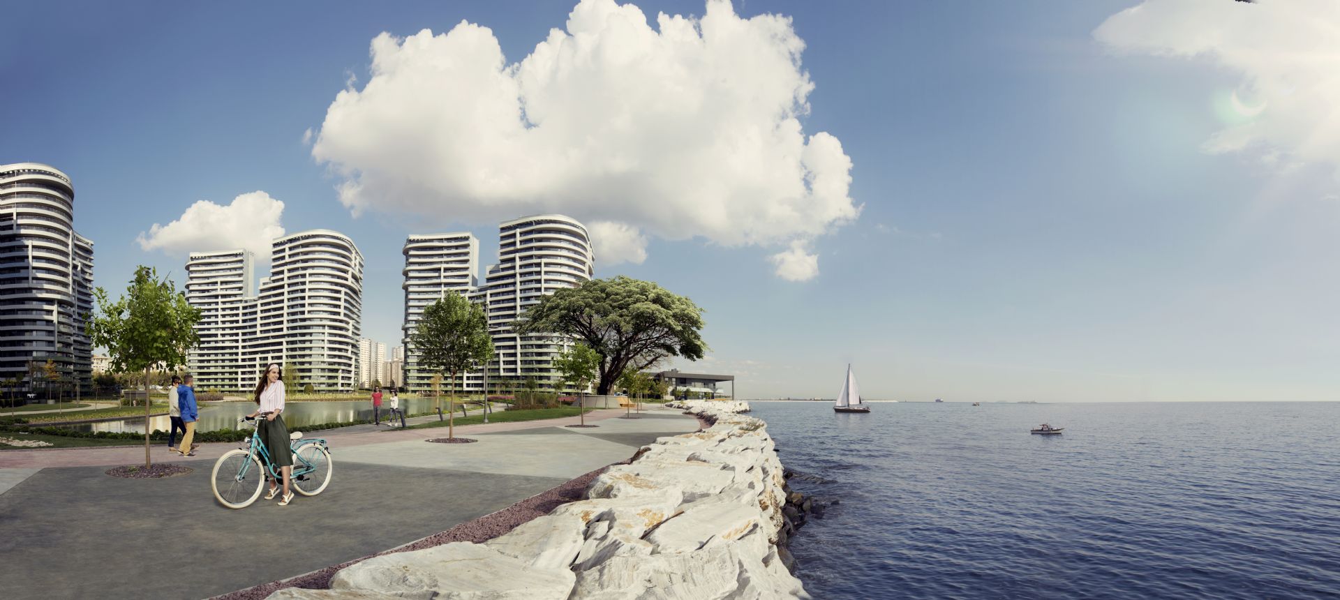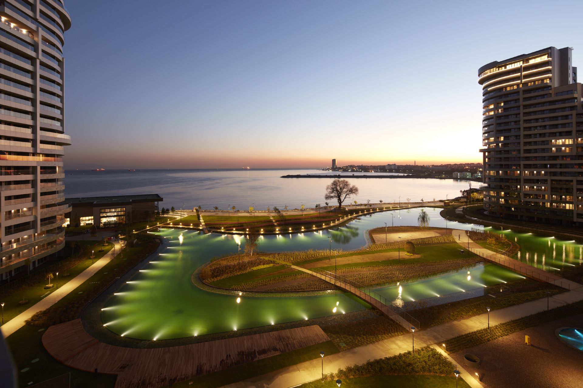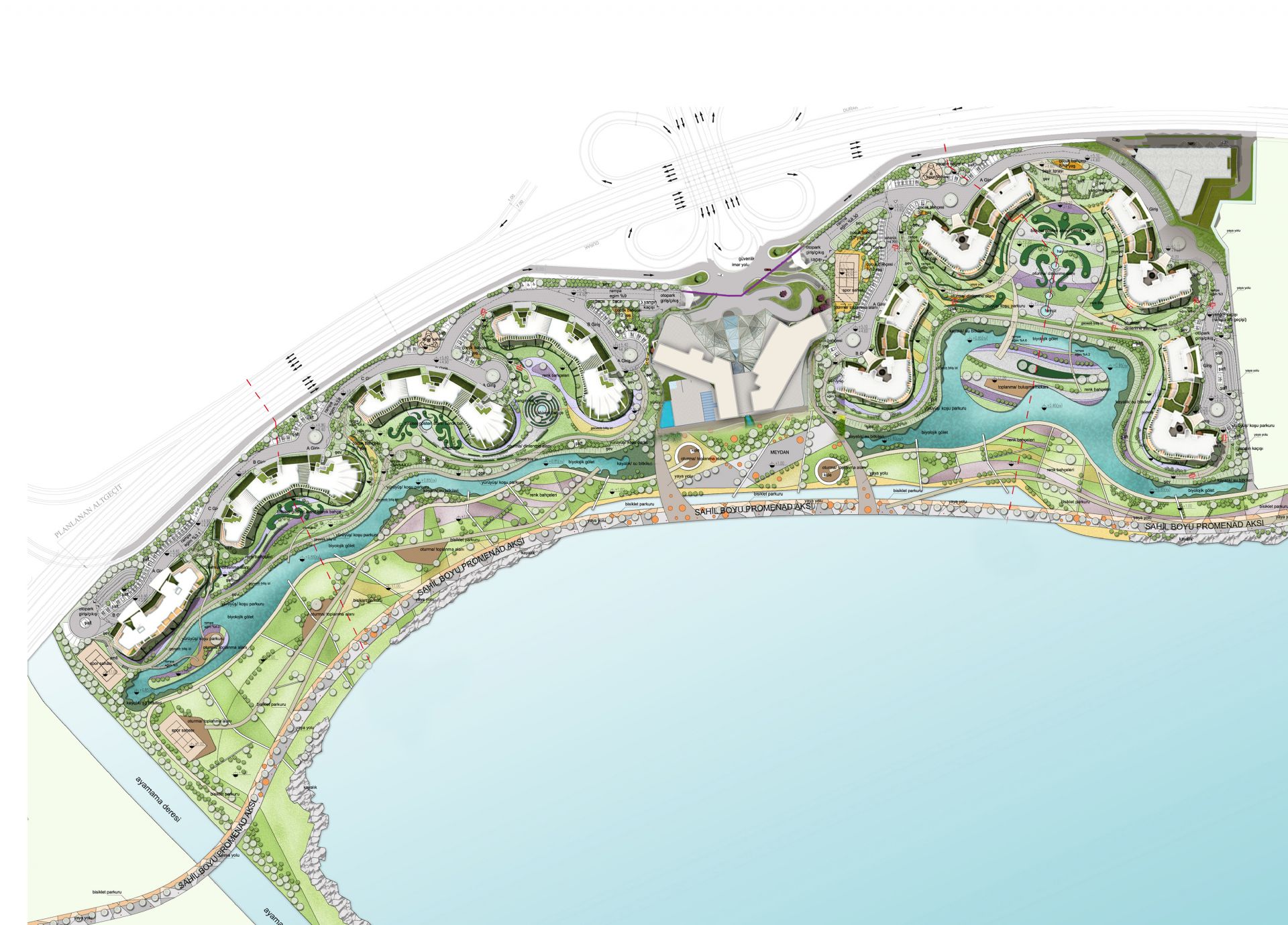 Projenin en önemli girdisi ‘su’yun ve yeşil dokunun mekansal olarak gündelik yaşama dahil edilmesidir. Su, arazinin içlerine rekreasyon ve sosyal donatı için kullanılmak amacıyla alınmış ve bu sayede kent zemini sürekliliğinde bir ilişki kurgulanmıştır. Arazi kullanımı yüksek binaların doğru konumlandırılmasıyla kullanıcıların yeşille, doğayla yakın ilişkide olabileceği alt ve üst yapıya sahiptir. Taşıt trafiğinin arazinin arkasında sonlandırılmasıyla kullanıcıların tüm alanda emniyetli bir şekilde, yaya olarak hareketi sağlanmış ve peyzaj alanlarıyla buluşması öngörülmüştür. Her yaş grubuna hitap eden çocuk oyun alanlarıyla zenginleşen rekreasyon alanları, farklı konseptteki bahçeler, peyzajdaki sert zeminlerin birer buluşma ve karşılaşma ortamına olanak vermesiyle sosyalleşmeyi üst düzeyde tutar.