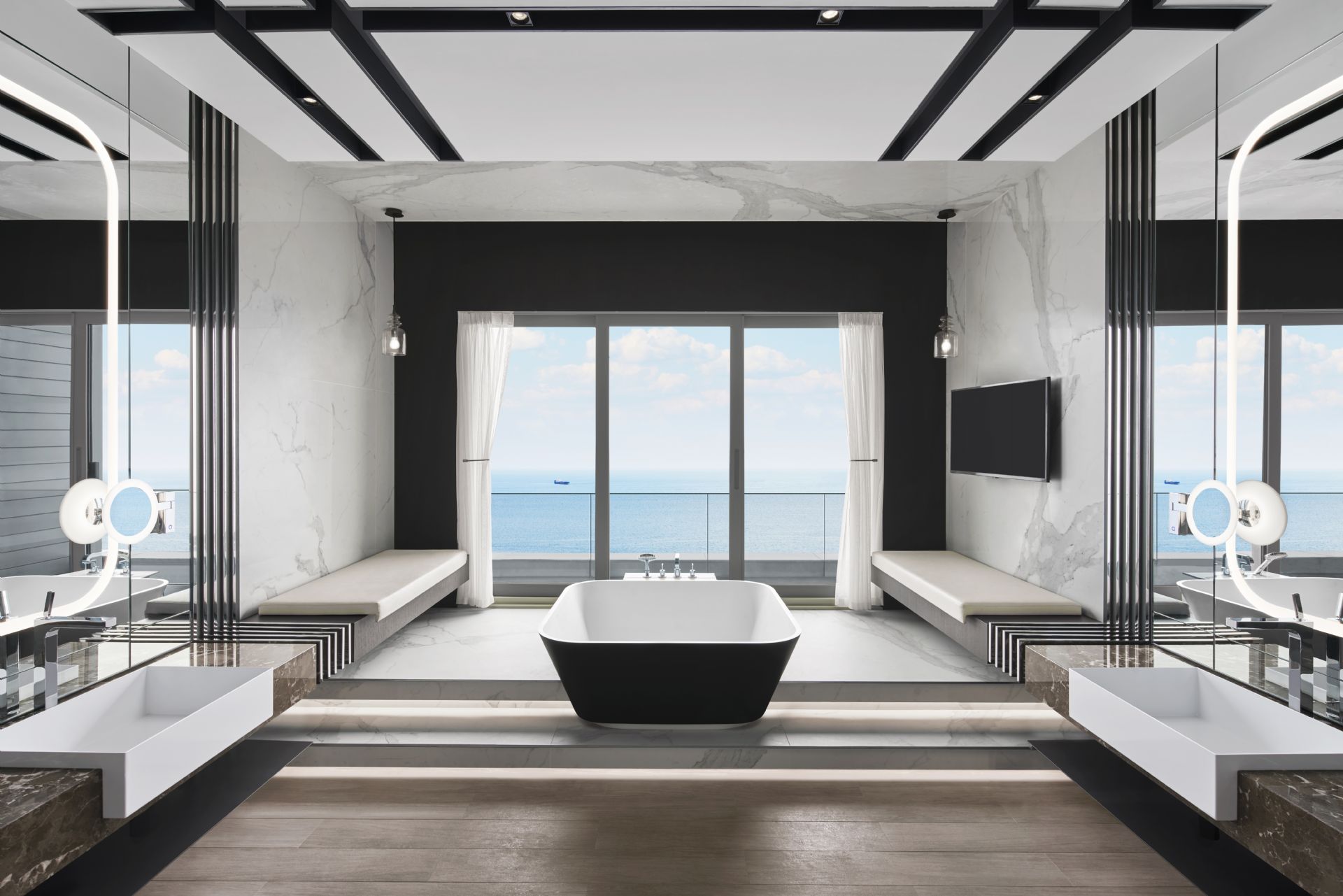 Seapearl projesinin kalbinde hizmet verecek olan otel ve rezidans projesi, konumu ve tüm projede gözetilen yüksek nitelikli rezidans hizmeti anlayışıyla İstanbul ile buluşurken, kentin dinamizmini ivmelendirecek bir anlayışla, tek kütle etkisinin korunduğu iki ayrı bina olarak tasarlanmıştır. Rezidans ve Otel bloklarının yan yana gelişleri İstanbul'un birbirine geçişli boğaz imgesinin ve kentlinin suyla buluşma deneyimlerinin yaşatıldığı bir konsepte sahiptir ve binalar, sükunetli ve güçlü sadelikle kente katılır. Selçuklu motifinin modernize edilmesiyle elde edilen görkemli dantel strüktürün bir araya getirdiği binada giriş aksında ilk adımdan itibaren suyla buluşma sağlanır ve bu etki lobide devam ettirilerek denizle görsel bir bütünlük sağlanır. Görkemli ama sade, lüks ama abartısız bir ele alışla projelendirilen otel ve rezidans üniteleri / odaları %100 oranında deniz manzarasına sahiptir. Geniş ve lüks standart odaların sahip olduğu balkon ve teraslar iç ve dış yaşamın bir arada özenle eritildiği yüksek kalitede mekansal deneyimlere olanak vermektedir.